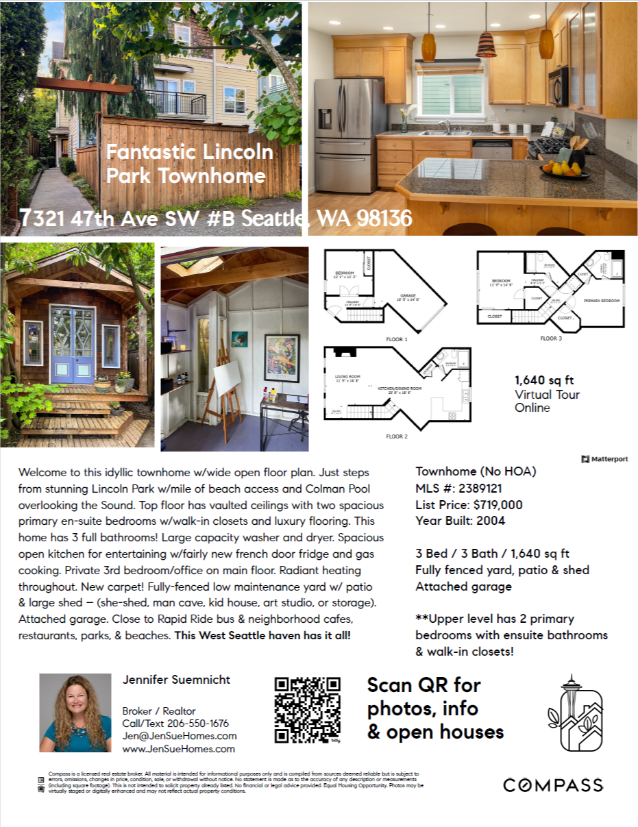 Jennifer Suemnicht, Seattle Real Estate Agent / Broker/ Realtor of Jen Sue Homes is licensed at Compass with offices in Seattle, Tacoma, Kirkland, & Bellevue, Washington. Jenβs mission is to provide friendly, professional service with honesty and integrity, achieving positive results, and creating relationships that last because of impeccable service. Whether you are buying your first or tenth home, selling, investing, or just looking for informationβ¦ contact Jen today!